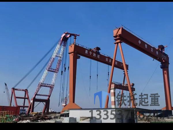 山東青島造船門式起重機(jī)是在地面軌道上運(yùn)行,用于船塢等大型焊接件吊裝作業(yè)的大型龍門起重機(jī),由水平橋架設(shè)置在兩條支腿上構(gòu)成門架形狀的橋架型起重機(jī)。其起升、小車運(yùn)行、橋架與橋式起重機(jī)相同。采用靜定系統(tǒng),一側(cè)為剛性支腿,一側(cè)為通過鉸接與橋架構(gòu)成柔性支腿。避免外載荷引發(fā)的側(cè)推力,同時(shí)補(bǔ)償橋架在溫度作用下的縱向變形。工作機(jī)構(gòu)依據(jù)不同要求裝設(shè)不同形式制動(dòng)器,同時(shí)還安裝了一系列行程限制器和安全裝置。