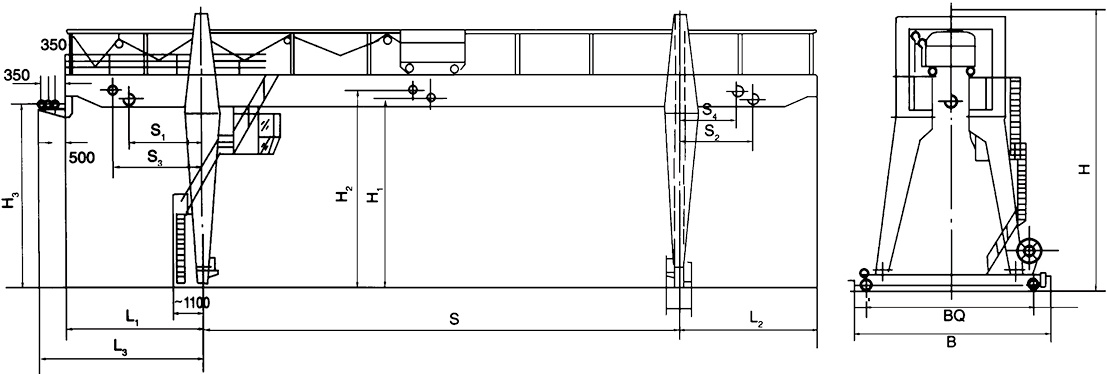 A型雙主梁吊鉤門式起重機適用于露天貨場、鐵路沿線作業(yè)進行一般的裝卸及起重搬運工作。A型門架結(jié)構(gòu),上面帶有馬鞍結(jié)構(gòu),受力合理,為國內(nèi)使用最廣泛的雙主梁門式起重機。根據(jù)其結(jié)構(gòu)形式,可分為包廂式MG,額定起重量5~320t;以及減
